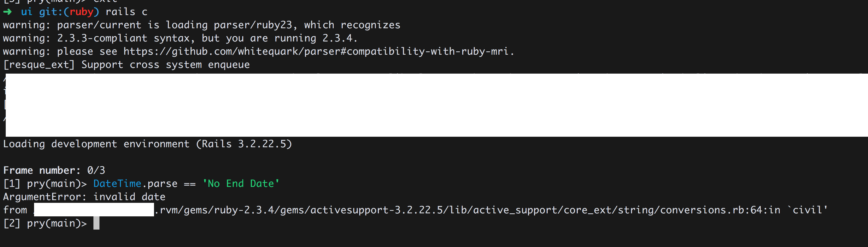 % ruby -v -r "date" -e "p DateTime.parse == 'No End Date'"