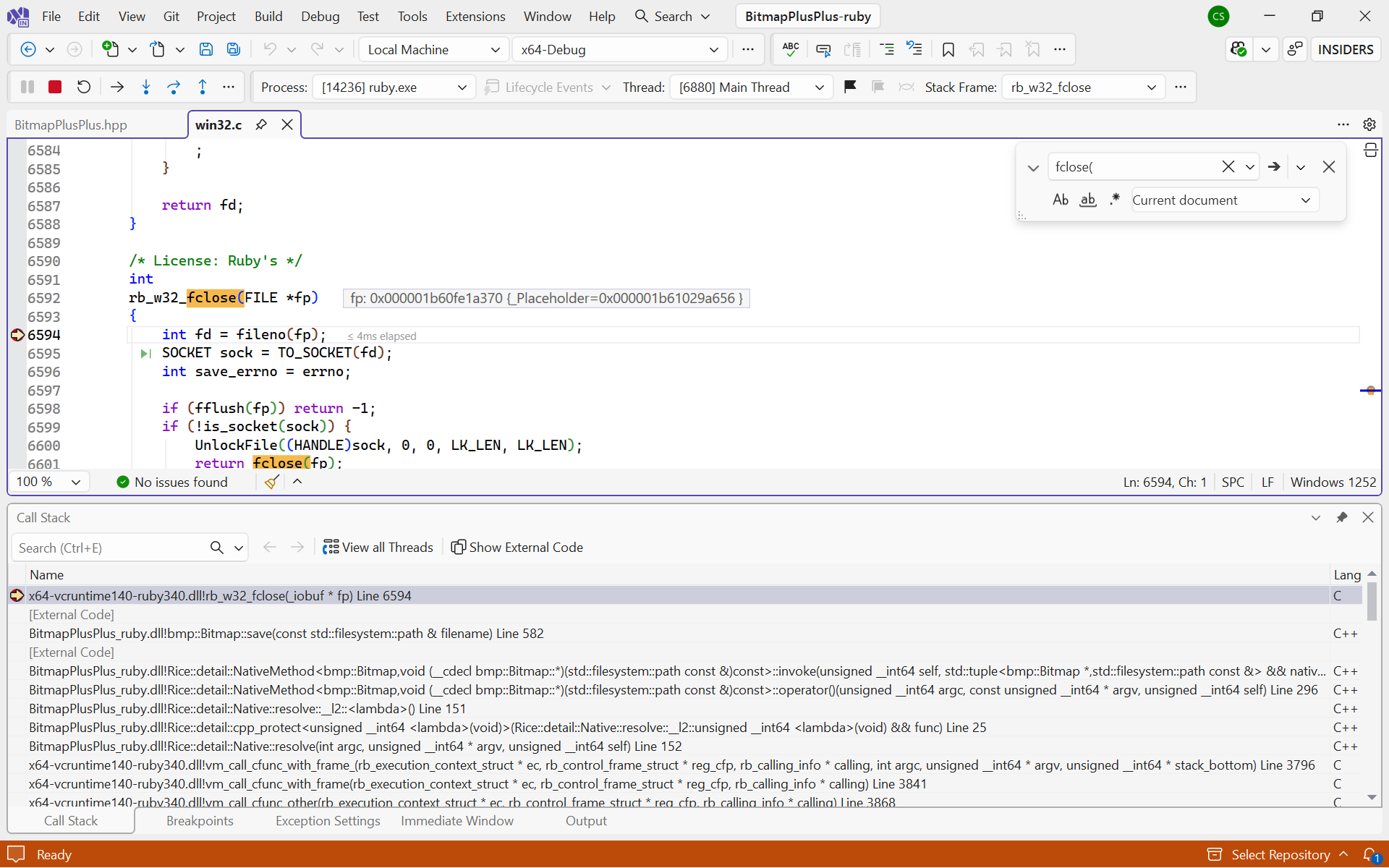 I have attached a screenshot showing the problem. Notice in the stack trace on the bottom of the page that the method bmp::Bitmap::save(const std::filesystem::path & filename) calls fclose but ends up calling the Ruby version! Not the UCRT version.